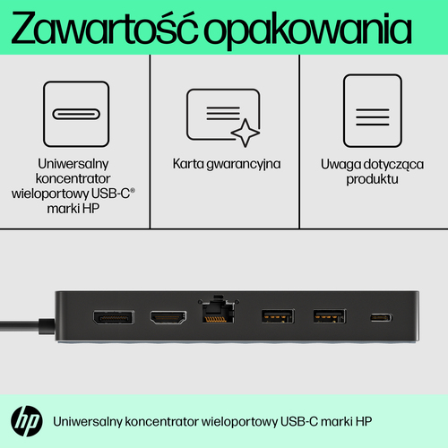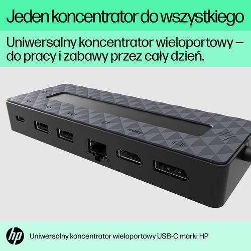 Odkryj nowe możliwości z uniwersalnym wieloportowym koncentratorem USB-C HP, który od teraz obsługuje każdy komputer zgodny ze standardem USB-C[1]. Siedem portów, jeden przewód zasilania i transmisji danych z funkcją passthrough oraz cała masa urządzeń peryferyjnych, które możesz podłączać wedle uznania. Rozwiązanie pozwala również na obsługę dwóch monitorów 4K[2] za pośrednictwem portów HDMI 2.0 i DisplayPort™ 1.2. Ten koncentrator spełni wszystkie Twoje potrzeby związane z łącznością.
