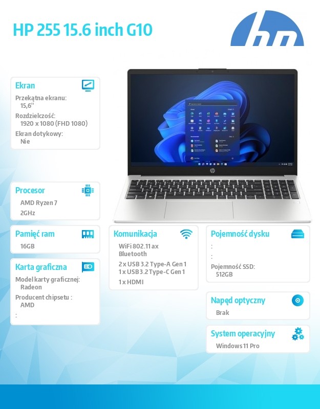 Laptop HP 255 G10 zapewnia podstawowe funkcje biznesowe w smukłej i lekkiej konstrukcji, którą można wszędzie ze sobą zabrać. 15,6-calowy ekran o 85-procentowym współczynniku proporcji do obudowy, wydajny procesor AMD Ryzen, szybka pamięć RAM i optymalna pamięć masowa dostarczają potrzebnej wydajności, a pomocne porty pozwalają podłączyć różne urządzenia peryferyjne wszystko to w bardzo przystępnej cenie.