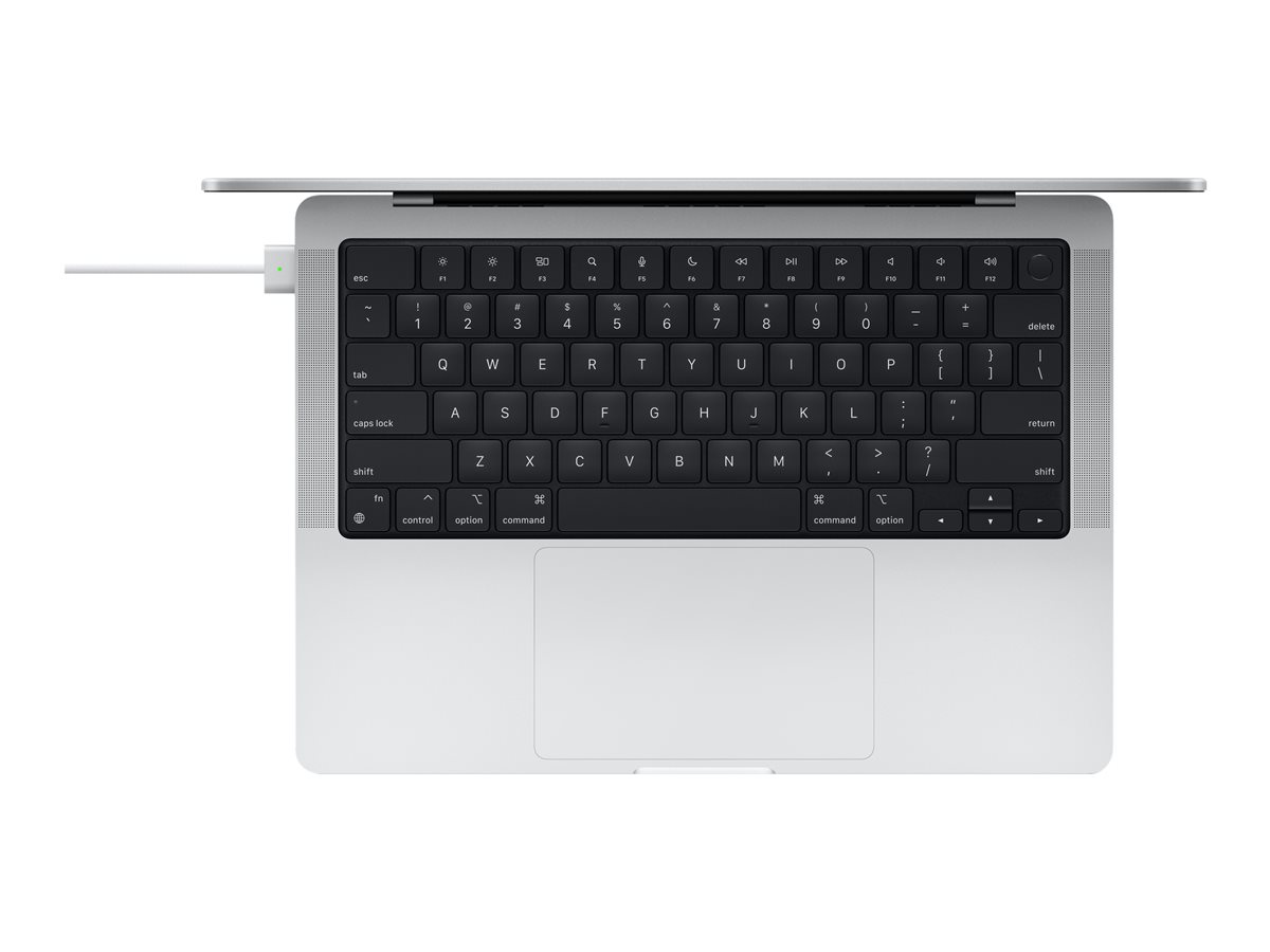 | Ten przewód do ładowania jest zakończony magnetycznym złączem MagSafe 3, które naprowadza wtyczkę na gniazdo zasilania MacBooka Pro i ułatwia jej podłączenie. Za pomocą przewodu do ładowania oraz zgodnego zasilacza USB-C możesz wygodnie i szybko ładować MacBooka Pro z gniazdka elektrycznego. Magnesy są wystarczająco silne, żeby uniemożliwić większość przypadkowych rozłączeń. Jednak w przypadku potknięcia się o przewód wtyczka od razu wypada z portu MacBooka Pro, zapobiegając jego uszkodzeniu. Podczas ładowania urządzenia dioda LED świeci się na pomarańczowo. Kolor zielony wskazuje, że jest ono w pełni naładowane. A dzięki wytrzymałej plecionej konstrukcji przewód jest bardzo trwały. | |