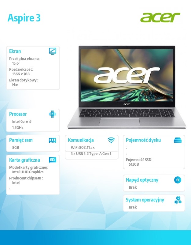 Laptop Acer Aspire dostępny jest na indywidualne zamówienie. Zapytaj o termin dostawy