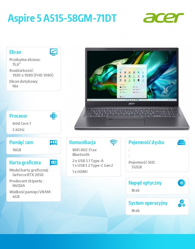 Laptop Acer Aspire dostępny jest na indywidualne zamówienie. Zapytaj o termin dostawy