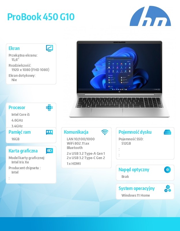 Laptop HP ProBook 450 15 oferuje rozwijającym się firmom wydajność, wielowarstwowe zabezpieczenia urządzeń końcowych oraz wytrzymałość w konstrukcji, którą można z łatwością rozbudować. Dzięki najnowszemu procesorowi Intel i baterii o długiej żywotności ten bogaty w funkcje komputer jest doskonale przystosowany do wymagających zadań oraz pracy hybrydowej.