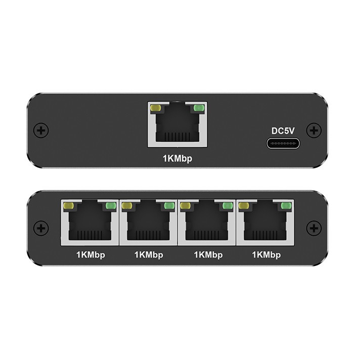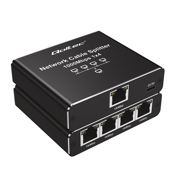 Wyposażony w 5 portów RJ45 (1x Input, 4x Output),