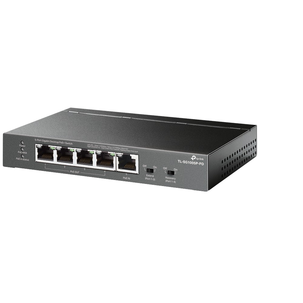 TL-SG1005P-PD Przełącznik PoE+ typu Desktop, 5 portów gigabitowych, w tym 1 port PoE++ IN i 4 porty PoE+ OUT