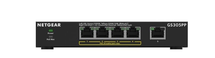 - Power-over-Ethernet: 4 porty PoE+ z łącznym budżetem mocy 83W, umożliwiających zasilanie bezprzewodowych punktów dostępu, kamer IP, telefonów IP i nie tylko