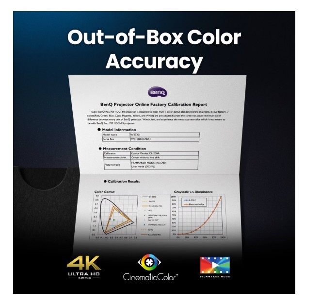 Kolory Zgodne z Wizją Reżyserów Doświadcz filmowej wierności obrazu dzięki projektorowi kina domowego BenQ W2720i, wykorzystującego technologię BenQ CinematicColor. Precyzyjnie obejmuje 90% przestrzeni kolorów DCI-P3 i 98% Rec.709, zapewniając dokładne odwzorowanie kolorów zgodne z wizją reżysera.