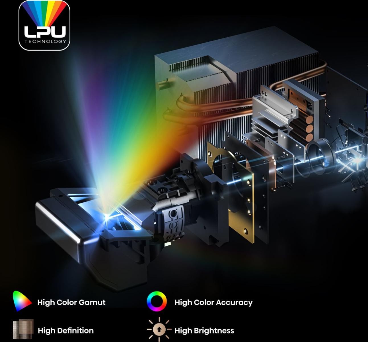 Laserowy silnik LPU zapewnia: szeroką paletę barw z odwzorowaniem ponad miliarda kolorów, precyzję odwzorowania kolorów, wysoką rozdzielczość 4K oraz wysoki poziom jasności.