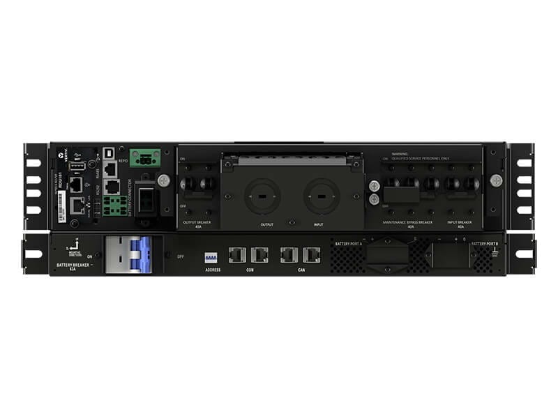 Zintegrowane obejście konserwacyjne (bypass) i rozdział zasilania Każdy zasilacz UPS Vertiv Liebert GXT5 litowo-jonowy(tylko modele 5-10 kVA) zawiera obejście konserwacyjne (bypass) 0U z wbudowanym rozdziałem zasilania. Umożliwia to serwisowanie lub demontaż zasilacza UPS bez przerywania zasilania podłączonego sprzętu.
