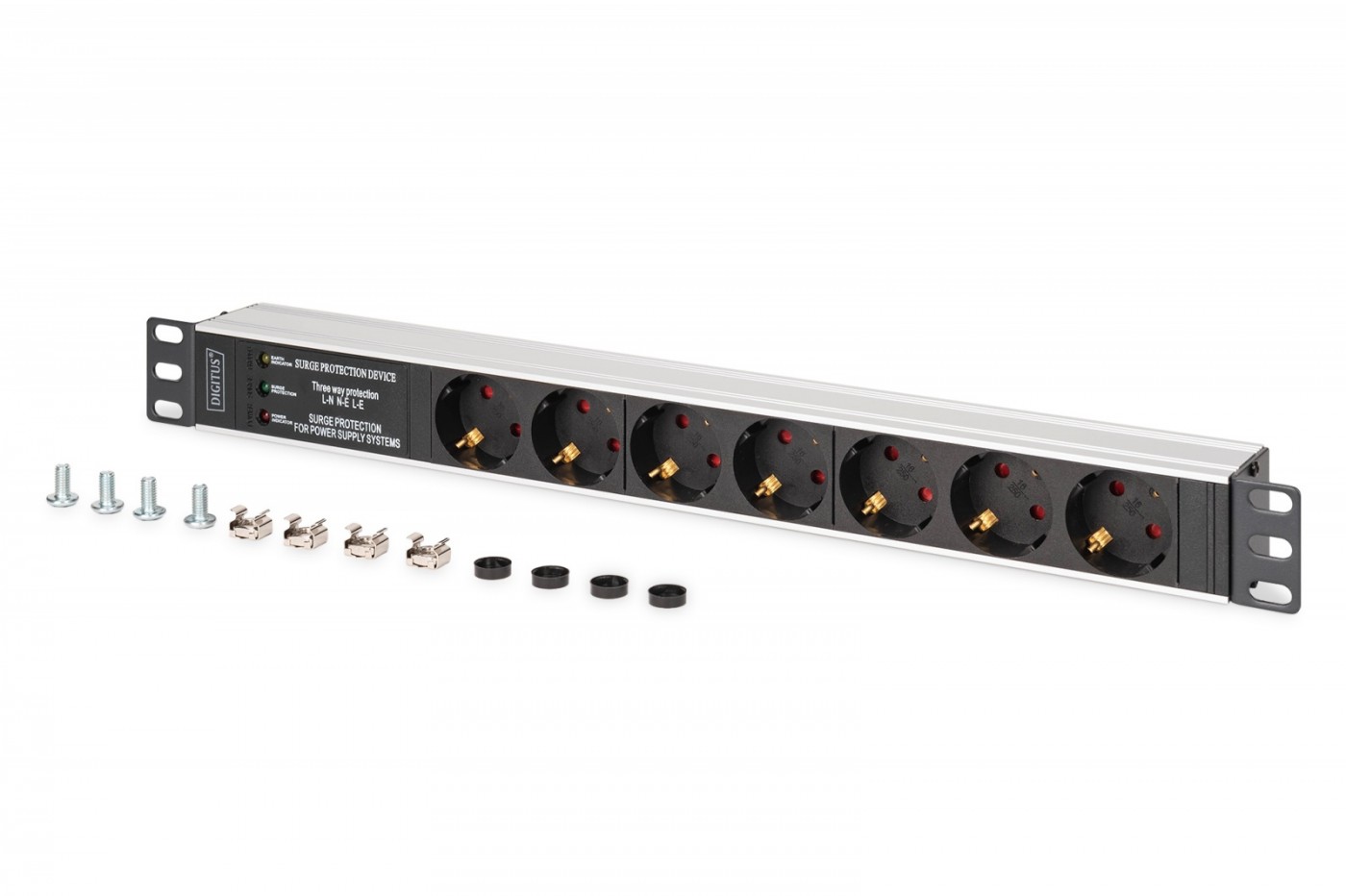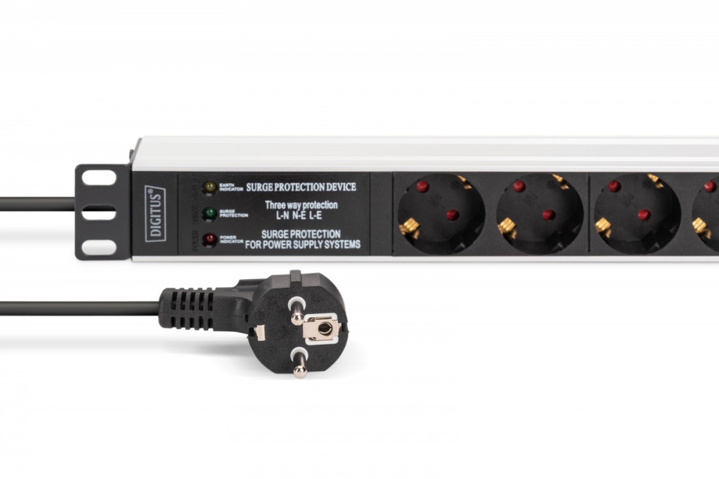 Listwa zasilająca PDU Rack 19" zab. przeciwprzepięciowe+filtr EMI/RFI, 7 gniazd Schuko CEE 7/3 (45°), kabel 2m wtyk Unischuko CEE 7/7, 16A, aluminiowa Listwy zasilające DIGITUS są idealnym rozwiązaniem dla sieci lub szafy serwerowej. Pod względem dystrybucji zasilania, PDU spełnia wymagania wielu zastosowań w IT, technologii sieciowej, laboratoriach i domu. Zintegrowany filtr sieciowy i zabezpieczenie przeciwprzepięciowe chronią podłączone obciążenia przed zakłóceniami z sieci. W zależności od typu obudowy, listwa gniazdowa może być montowana z odczepami skierowanymi w prawo lub w lewo.