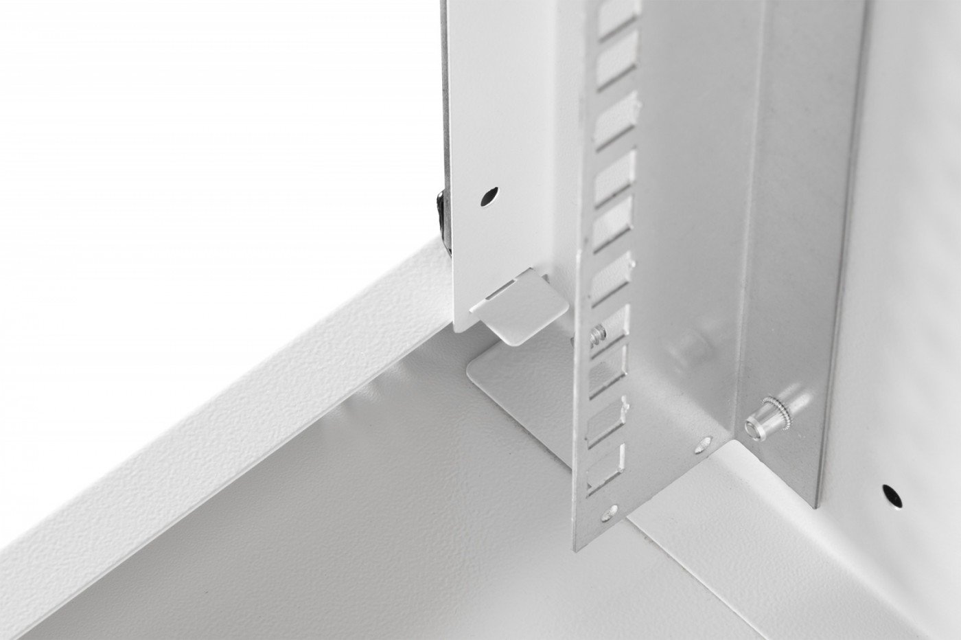 Szafa teleinformatyczna DIGITUS do montażu ściennego wyposażona jest w przeszklone drzwi oraz przepust kablowy w dachu i w podłodze. Konstrukcja stalowa wykonana z blachy stalowej o grubości do 1,5 mm. Istnieje możliwość zmiany strony montażu zawiasów drzwi oraz regulacja głębokości. Szafy rack są dostarczane w stanie niezmontowanym, w płaskiej paczce. Montaż odbywa się w kilku prostych krokach dzięki dołączonej instrukcji "krok po kroku".