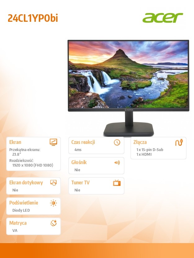 Monitor 24CL1YP0bi wyróżnia się doskonałą jakością obrazu. Dzięki przekątnej ekranu o wielkości 23,8 cala oraz proporcjom 16:9, każdy szczegół na ekranie jest wyraźny i ostro zarysowany. Matryca VA zapewnia szerokie kąty widzenia, co sprawia, że obraz jest doskonale widoczny nawet podczas długotrwałego korzystania z monitora.