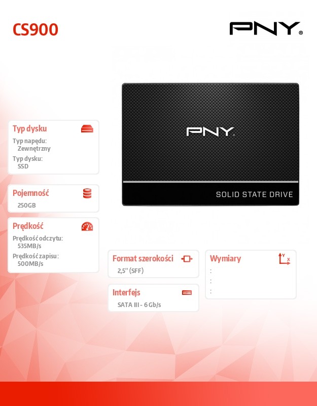 Dysk SSD CS900 2,5-calowy dysk półprzewodnikowy (SSD) SATA-III (6 Gb/s) PNY CS900 to główna linia dysków SSD PNY o wysokiej wydajności. To doskonały wybór na aktualizacja z dysku twardego (HDD). PNY CS900 został zaprojektowany jako łatwy i opłacalny zamiennik dysku twardego dla istniejącego systemu PC, bez konieczności poświęcania wydajności. Aktualizacja do CS900 SSD pomoże Ci doświadczyć ogólnego wzrostu wydajności. Uruchom, wyłącz, i ładuj aplikacje w kilka sekund. Bez ruchomych części model PNY CS900 jest bardzo wytrzymały i objęty 3-letnią ograniczoną gwarancją. PNY CS900 to doskonały wybór pod względem energooszczędności i zużywa znacznie mniej energii niż dyski twarde. Użytkownicy mogą korzystać z mniejszego zużycia energii, dłuższej żywotności baterii oraz chłodniejszego i cichszego systemu. Poświęć więcej czasu na korzystanie z systemu, a mniej na martwienie się o zużycie baterii. Linia CS900 jest dostępna w różnych pojemnościach od 120 GB do 2 TB. Dysk PNY CS900 został zaprojektowany z zachowaniem tego samego poziomu jakości i trwałości, z którego korzystają nasi konsumenci w przypadku dysków SSD CS1311. Obszerne testowanie i rygorystyczny proces walidacji zapewnia zgodność na różnych platformach i wielu systemach operacyjnych. Cechy: