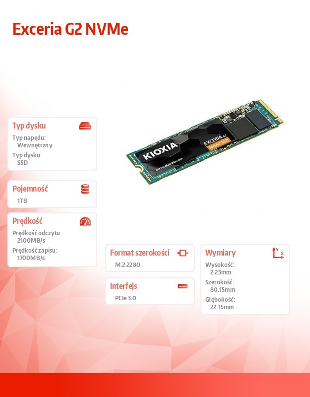 Druga generacja dysków KIOXIA EXCERIA G2 SSD to nowy poziom wydajności z maks. sekwencyjną szybkością odczytu sięgającą 2100 MB/s 1, umożliwiając tym samym szybsze uruchamianie, transfer plików oraz działanie systemu. Zastosowanie pamięci BiCS FLASH 3D flash umożliwia osiągnięcie pojemności w podstawowej klasie dysków SSD do 2 TB, a interfejs M.2 2280 pozwala na ich zastosowanie zarówno w komputerach stacjonarnych, jak i notebookach.
