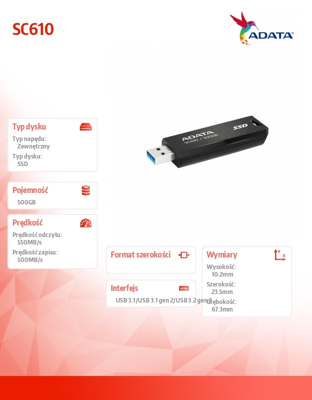 Zewnętrzny dysk SSD SC610 Pamięć flash SC610 obsługuje prędkość transmisji USB 3.2 Gen2 z szybkością odczytu/zapisu sięgającą 550/500MB na sekundę. Interfejs typu A jest kompatybilny z wieloma komputerami. Wydajne przechowywanie Trudno sobie wyobrazić, że dysk SSD może być tak kompaktowy! Interfejs transmisji USB 3.2 Gen2 zapewnia przepustowość do 10 Gb na sekundę. Całkowite przesłanie pliku wideo wysokiej rozdzielczości o pojemności 10 GB i rozdzielczości 4K zajmuje tylko około 20 sekund. Dysk jest wstecznie kompatybilny z urządzeniami USB 2.0. Osiągaj zawrotne prędkości SC610 oferuje prędkość transmisji do 550/500 MB na sekundę, czyli 5 razy szybciej niż zwykłe dyski flash. Zapewnia taką samą wydajność jak dysk SSD. Wystarczy go podłączyć, aby szybko odczytać i zapisać wszystkie typy plików o dużej i małej pojemności. Jego kompaktowa obudowa jest pełna wyjątkowych możliwości! Bez zatyczki i bez kabli SC610 jest wyposażony w wysuwane złącze USB, dzięki czemu gubienie zatyczek należy już do przeszłości. Brak kabli oznacza wygodę przechowywania. Twoja biblioteka gier SC610 obsługuje wiele najnowszych konsoli do gier, możesz więc przechowywać wszystkie gry nie zajmując przestrzeni fizycznej. Duża pojemność, która sprosta każdemu zadaniu Z SC610 nie musisz się już martwić o pojemność. Niezależnie od tego, czy tworzysz portfolio, edytujesz czy retuszujesz pliki, przechowywanie jest wygodne i dostęp do nich jest błyskawiczny.