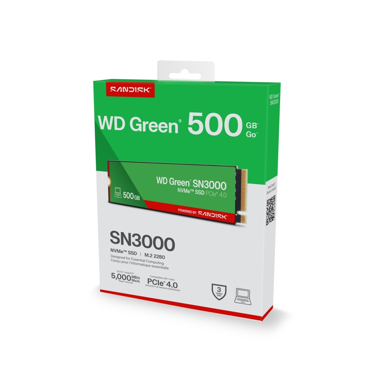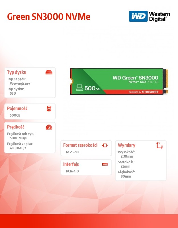 Dodaj energii swojemu komputerowi dzięki dyskowi SSD WD Green SN3000 NVMe Twój komputer może być jeszcze szybszy, a ważne pliki mogą być zawsze pod ręką. Niezależnie od tego, czy modernizujesz pamięć swojego komputera, aby poprawić szybkość uruchamiania aplikacji i dostępu do plików, czy chcesz po prostu zwiększyć pojemność, aby zapisywać więcej plików, dysk SSD WD Green SN3000 NVMe zwiększa wydajność pamięci masowej i zapewnia więcej potrzebnego miejsca. Dysk SSD PCIe Gen4 z prędkością odczytu do 5000 MB/s o smukłej konstrukcji M.2 umożliwia korzystanie z wielu aplikacji i zapewnia niezwykle krótki czas reakcji, pozwalając na pracę bez ograniczeń. Niezwykła wydajność magazynu danych dzięki PCIe Gen4 Zmaksymalizuj wydajność komputera dzięki wysokim prędkościom oferowanym przez technologię PCIe Gen4 NVMe. Krótkie czasy ładowania, szybkie uruchamianie aplikacji i bezproblemowe przeglądanie stron internetowych dzięki prędkości do 5000 MB/s. Duża pojemność dysku SSD pozwala na ciągłe zapisywanie plików Zwiększ możliwości swojego komputera dzięki dyskowi SSD o pojemności do 2 TB, aby mieć swoje zdjęcia, filmy i inne ważne pliki zawsze pod ręką. Smukła konstrukcja dysku SSD M.2 kompatybilna z komputerem Dysk SSD WD Green SN3000 posiada jednostronną konstrukcję M.2 2280, dzięki czemu jest kompatybilny z laptopami o cienkiej obudowie i małymi komputerami, a jednocześnie oferuje dużą pojemność zwiększającą możliwości komputera. Tchnij nowe życie w swój komputer Obsługa wielu aplikacji jednocześnie przy niezwykle krótkim czasie reakcji, szybsze przenoszenie i zapisywanie plików, a także poprawa wydajności pracy dzięki technologii NVMe i Western Digital nCache 4.0. Niezawodny magazyn danych, zaufana marka Zaufaj marce wybieranej przez profesjonalistów i ciesz się 3-letnią ograniczoną gwarancją. Bezpiecznie przechowuj wszystkie swoje dane. Przenoś dane za pomocą oprogramowania Acronis True Image dla Western Digital Przenieś dane ze swojego poprzedniego dysku NVMe na nowy dysk SSD WD Green SN3000 NVMe za pomocą dostępnego do pobrania oprogramowania do migracji danych Acronis True Image for Western Digital, dzięki któremu możesz kontynuować pracę od tego miejsca, w jakim została przerwana.