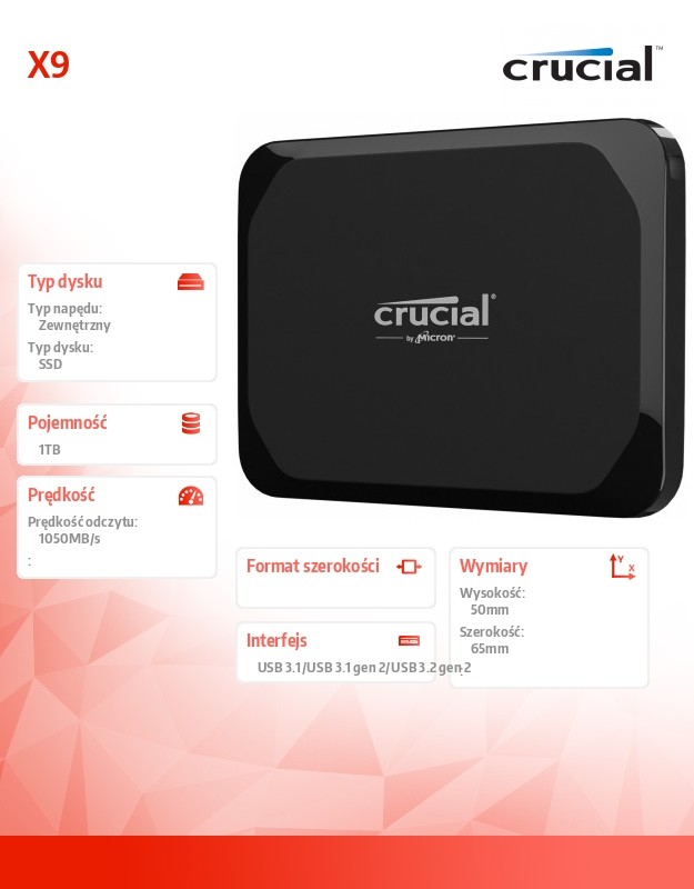 Niezawodna pamięć dla Twoich ulubionych urządzeń, gdziekolwiek jesteś - taki właśnie jest przenośny dysk SSD Crucial X9. Przesyłanie plików z szybkością do 1050 MB/s i pojemności do 4 TB wystarczą na wszystkie Twoje ulubione zdjęcia, filmy, gry i nie tylko. Crucial X9 jest do 7,5 razy szybszy niż przenośne dyski twarde, jest odporny na upadki do 7,5 stóp (2 metry) oraz kompatybilny z komputerami PC, Mac, tabletami, konsolami do gier, telefonami z systemem Android i nie tylko, co czyni go idealnym rozwiązaniem do przechowywania danych typu plug-and-play.