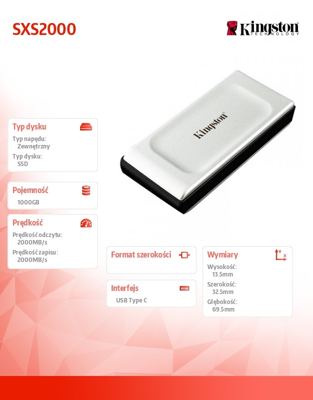 - Przenośny dysk SSD Kingston XS2000 wykorzystuje interfejs USB 3.2 Gen 2x2, aby zapewnić wydajność nowej generacji w kompaktowej formie dysku zewnętrznego. Dzięki niezwykłej szybkości transferu danych, wynoszącej do 2000MB/s1, dysk XS2000 zapewnia doskonałą wydajność przy niewielkich zakłóceniach. XS2000 oferuje dostęp do szybkiej pamięci masowej o pojemności do 2TB2, która umożliwia błyskawiczne przenoszenie i edytowanie zdjęć o wysokiej rozdzielczości, filmów 8K oraz dużych dokumentów. Dysk jest przystosowany do przyszłych standardów i wymagań dotyczących pamięci masowej i natychmiast gotowy do współpracy z większością urządzeń. Z myślą o twórcach treści jest wyposażony w złącze USB Type-C3, które umożliwia szybki dostęp do danych zapisanych w komputerze lub urządzeniu mobilnym. Dzięki zdejmowanej wzmocnionej nakładce i obudowie o klasie szczelności IP554 dysk XS2000 jest odporny na wnikanie wody i pyłu, dzięki czemu idealnie sprawdza się podczas terenowych sesji zdjęciowych i w innych sytuacjach niezależnie od tego, czy są to projekty związane z pracą, zabawą, czy hobby.