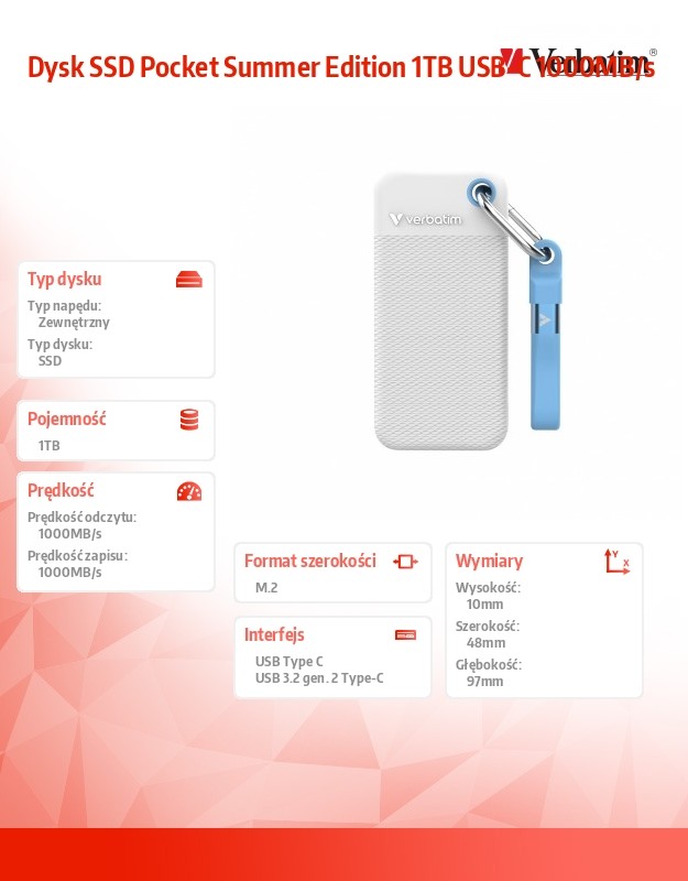 Verbatim Pocket SSD Summer Edition Ultralekki przenośny dysk SSD z superszybkim interfejsem USB-C 3.2 Gen 2 i letnim designem Verbatim Pocket SSD Summer Edition to kompaktowy i stylowy dysk przenośny, zaprojektowany z myślą o użytkownikach, którzy cenią sobie szybki dostęp do danych, mobilność oraz indywidualny wygląd. Idealny do pracy w podróży, przechowywania dużych plików i codziennego użytku. Wersja letnia oferuje nowoczesne kolory oraz dwie wymienne gumowe osłony, które zapewniają dodatkową ochronę i personalizację. Wydajność USB 3.2 Gen 2 i Kompaktowa moc w Twojej kieszeni Dysk SSD Verbatim waży zaledwie 58 gramów i ma nieco ponad 9 centymetrów długości, co sprawia, że z łatwością zmieścisz go w tylnej kieszeni, torbie lub przypniesz do kluczy. Jego kompaktowa obudowa wykonana z ognioodpornego poliwęglanu zapewnia trwałość i odporność na codzienne użytkowanie. Dzięki interfejsowi USB 3.2 Gen 2, Pocket SSD oferuje prędkość przesyłu danych do 10 Gb/s, co przekłada się na szybki zapis i odczyt danych nawet do 1000 MB/s. Idealny do edycji wideo w wysokiej rozdzielczości, przesyłania dużych plików graficznych czy intensywnych zadań gamingowych. Dysk współpracuje z systemami Windows oraz macOS. Solidność bez kompromisów Pocket SSD korzysta z pamięci flash, dzięki czemu nie zawiera ruchomych części. To sprawia, że jest bardziej odporny na uszkodzenia mechaniczne, działa bezgłośnie i zużywa mniej energii niż tradycyjne dyski twarde. Letnia edycja dysku zawiera dwie kolorowe gumowe osłony, które chronią przed zarysowaniami i wstrząsami oraz pozwalają dopasować wygląd urządzenia do Twojego stylu. Zmieniaj rękawy w zależności od humoru lub okoliczności. Wygoda w podróży Do zestawu dołączony jest brelok do kluczy, który pozwala przypiąć dysk do plecaka, torby lub paska. Przemyślany uchwyt na kabel zapobiega jego plątaniu i sprawia, że zawsze masz wszystko pod ręką. Bezpieczeństwo danych z Nero Backup W trosce o ochronę Twoich danych, Verbatim dołącza oprogramowanie Nero Backup (dla systemu Windows), które pozwala tworzyć kopie zapasowe plików, folderów i całych dysków. Możliwe jest również zaplanowanie automatycznych backupów w wybranych przedziałach czasowych. Specyfikacja techniczna: