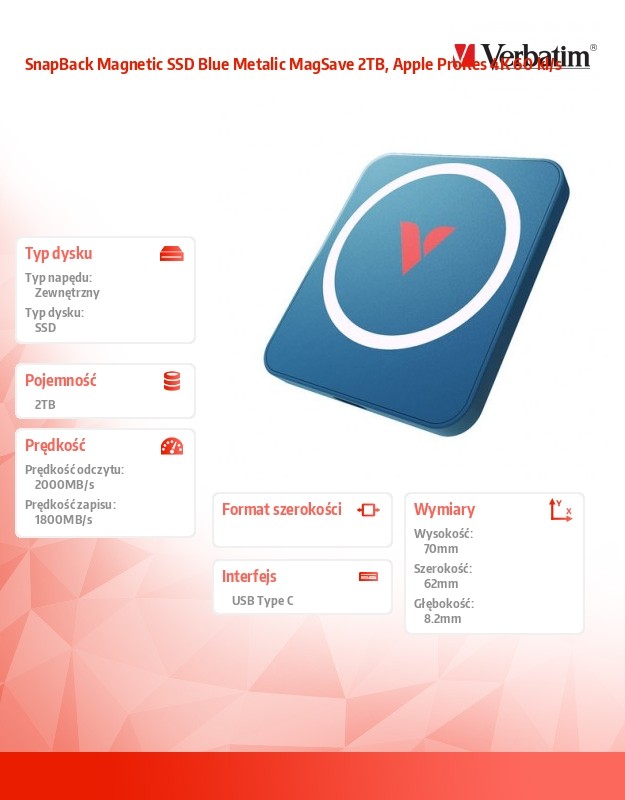 Verbatim SnapBack SSD 2TB Twoja mobilna przestrzeń na kreatywność Verbatim SnapBack SSD 2TB to innowacyjny zewnętrzny dysk półprzewodnikowy stworzony z myślą o twórcach treści, którzy potrzebują szybkości, mobilności i wygody. Dzięki pełnej kompatybilności z systemem MagSafe, urządzenie magnetycznie mocuje się do obudowy zgodnego smartfona, zapewniając stabilne i bezpieczne połączenie bez dodatkowych uchwytów. SnapBack został zaprojektowany dla kreatywnych w ruchu. Niezależnie od tego, czy nagrywasz vlogi, streamujesz na żywo, czy rejestrujesz filmy w 4K, możesz liczyć na bezproblemowe zapisywanie materiałów bezpośrednio na dysku. Obsługa formatu Apple ProRes 4K/60 fps gwarantuje profesjonalną jakość nagrań i eliminuje ryzyko braku miejsca w pamięci telefonu. Wyposażony w szybki interfejs USB 3.2 Gen 2x2, SnapBack umożliwia transfer danych z prędkością do 20 Gb/s. To oznacza błyskawiczne przesyłanie dużych plików multimedialnych i szybki dostęp do projektów. W zestawie znajdują się dwa praktyczne kable USB-C: krótki kabel w kształcie litery U, idealny do pracy ze smartfonem, oraz dłuższy kabel do podłączenia z komputerem PC lub Mac. Dzięki dołączonemu oprogramowaniu Nero Backup 3-2-1 tworzenie kopii zapasowych staje się proste i automatyczne, co zapewnia dodatkowe bezpieczeństwo Twoich projektów zarówno w pracy terenowej, jak i w biurze. Ultrakompaktowa konstrukcja ważąca jedynie 40 g sprawia, że SnapBack zmieści się w kieszeni i zawsze będzie pod ręką gotowy, gdy tylko pojawi się inspiracja.