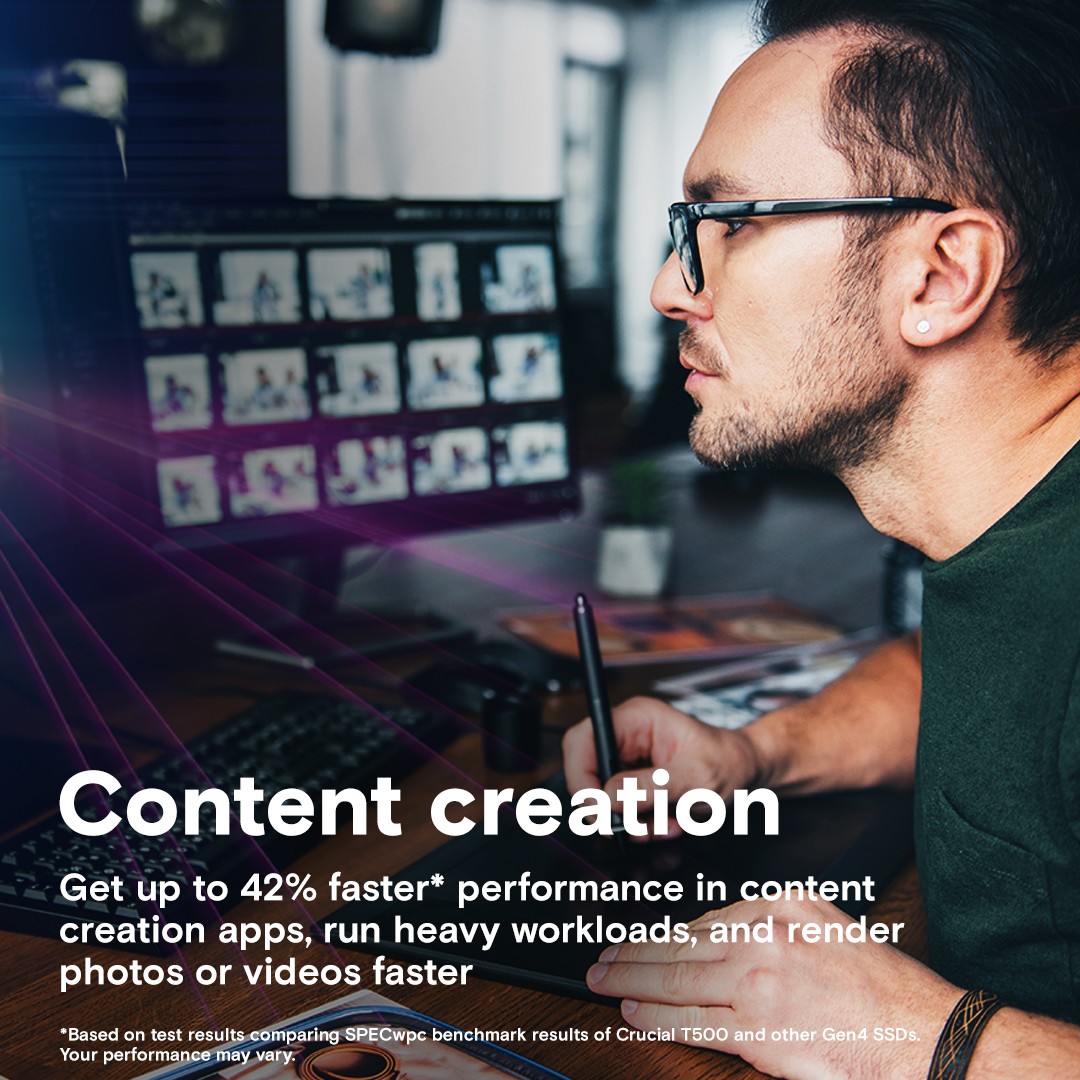 Dysk SSD Crucial T500 PCIe Gen4 NVMe został stworzony do wysokowydajnego grania, modernizacji konsoli do gier PlayStation 5 (PS5) oraz edycji zdjęć i wideo. T500 oferuje błyskawiczne prędkości do 7400 MB/s i jest wyposażony w technologię Microsoft DirectStorage, która skraca czasy ładowania i przyspiesza renderowanie w grach oraz w studiach kreatywnych.