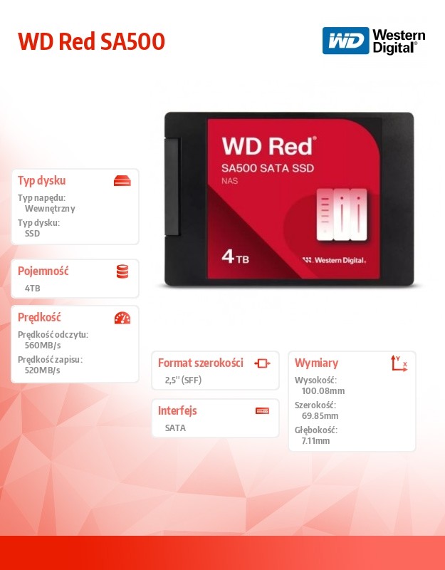 Moc Red w dyskach SSD Zwiększ wydajność i skróć czas reakcji swojego systemu NAS z dyskiem WD Red SA500 NAS SATA SSD. Systemy NAS działają bez przerwy, dlatego niezawodny dysk twardy to kwestia najwyższej wagi. W przeciwieństwie do standardowych dysków SSD dyski WD Red NAS SATA SSD zostały zaprojektowane specjalnie z myślą o pracy ciągłej 24 godziny na dobę, 7 dni w tygodniu i przetestowane w takim środowisku.