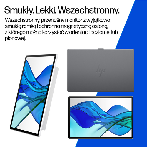Ćwicz wszechstronność w dowolnej przestrzeni, korzystając z ultrasmukłego i lekkiego przenośnego monitora, który możesz łatwo schować do torby, dzięki wytrzymałej, magnetycznej osłonie, która może być również pomocna jako podkładka pod mysz. Wbudowana podpórka układa się w orientacji poziomej lub pionowej, aby dopasować się do Twojej pracy.