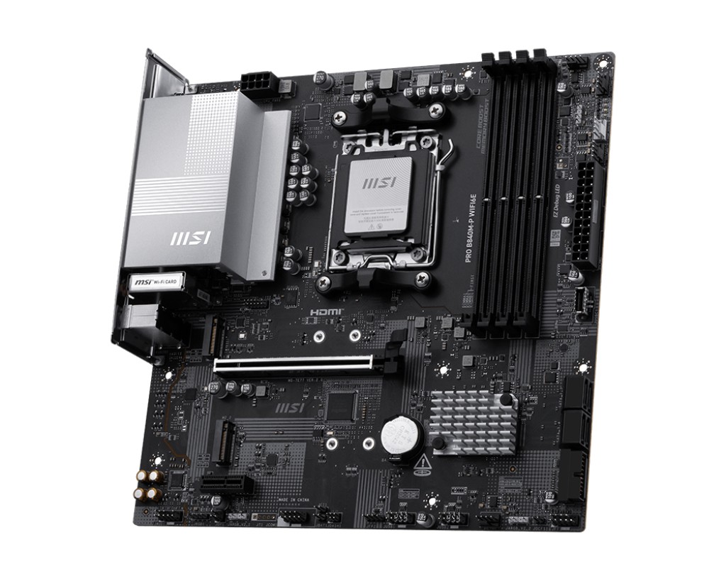 Obudowa PRO B840M-P WIFI6E oferuje prosty design z harmonijną, srebrną kolorystyką, która idealnie pasuje zarówno do białych, jak i czarnych komputerów. Została zaprojektowana z wieloma ekskluzywnymi funkcjami MSI, w tym Wi-Fi 6E z anteną EZ, kartą sieciową 2.5G LAN oraz gniazdem PCIe 4.0 M.2, a także jest gotowa na procesory AMD Ryzen serii 9000.
