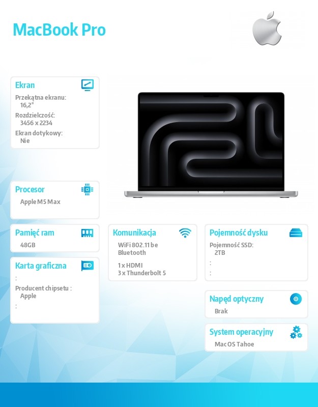 AI Stworzony dla AI. Od czipa poczynając. Układ scalony Apple i wszystkie kluczowe, napędzające go podsystemy zostały zaprojektowane z myślą o sztucznej inteligencji, łącząc sprzęt, oprogramowanie i ekosystem w jedną potężną platformę. Dlatego możesz przetwarzać wymagające zadania oparte na AI bezpośrednio na urządzeniu i z niesamowitą energooszczędnością. A przy tym masz pewność, że wbudowane funkcje bezpieczeństwa i ochrony prywatności są integralną częścią całego systemu, a nie tylko dodatkiem. Apple Intelligence. Zadajesz zadanie. I zrobione. Apple Intelligence pomaga pisać, wyrażać siebie i ogarniać wszystko bez wysiłku. Zamień krótką notatkę w profesjonalne ogłoszenie. Usuń ze zdjęć niechciane obiekty za pomocą narzędzia Oczyść. Kreuj wyjątkowe obrazy za pomocą nowych stylów ChatGPT w Image Playground. I korzystaj z inteligentnych akcji w apce Skróty, żeby tworzyć automatyzacje - na przykład porównywać transkrypcję audio z notatkami czy wyodrębniać kluczowe informacje z pliku PDF. Apple Intelligence to Twoje AI. Potężne możliwości. Z potężną ochroną prywatności. System Apple Intelligence zaprojektowano z myślą o nieustannej ochronie Twojej prywatności. Przetwarza dane bezpośrednio na Macu i jest z nim ściśle zintegrowany. Ma więc dostęp do Twoich osobistych informacji, ale ich nie gromadzi. A dzięki przełomowej prywatnej chmurze obliczeniowej Apple Intelligence może korzystać z większych modeli dostępnych na serwerach działających na układach scalonych Apple i obsługiwać bardziej złożone zapytania, chroniąc jednocześnie Twoją prywatność. Bateria Bateria na cały dzień bez gniazdka. MacBook Pro ma najdłuższy czas pracy na baterii w historii Maca - nawet 24 godziny. Możesz więc pracować, tworzyć i grać przez cały dzień. Wszystkie modele zapewniają tę samą fantastyczną wydajność niezależnie od tego, czy są podłączone do gniazdka, czy nie. A Ty, zamiast szukać kontaktu, możesz poświęcić czas na programowanie, naukę, strumieniowanie i inne pasje. W razie potrzeby funkcja szybkiego ładowania uzupełni baterię do 50% w zaledwie 30 minut. macOS Tahoe Najnowszy. I tak znajomy. macOS Tahoe wprowadza nowy, choć znajomy wygląd - Liquid Glass. To najpiękniejsza i najpotężniejsza wersja macOS w historii, pełna nowych sposobów na zwiększenie produktywności i płynną współpracę z iPhonem. I stworzona dla Apple Intelligence. Wyświetlacz Daj się olśnić. Przejście z pracą ze słonecznego tarasu do ciemnej pracowni? Jasna sprawa. Olśniewający wyświetlacz Liquid Retina XDR zapewnia 1600 nitów jasności szczytowej w trybie HDR. W mocnym świetle osiąga nawet 1000 nitów dla treści SDR, żeby także w plenerze wszystko na ekranie było bardziej czytelne. A gdy jest ciemno, zmniejsza jasność do jednego nita, by i wtedy pracowało się komfortowo. Kamera Zabłyśnij w centrum kadru. Kamera 12MP Center Stage sprawi, że wypadniesz świetnie w każdym świetle. A w połączeniu z zaawansowanymi mikrofonami i głośnikami pomoże Ci w zdalnym poprowadzeniu spotkania. Porty i łączność Masz potężne kontakty. MacBook Pro ma zestaw portów do podłączania szybkich urządzeń peryferyjnych lub wyświetlaczy o wysokiej rozdzielczości i do bezpośredniego odczytywania kart SDXC. Modele z czipem M5 mają port Thunderbolt 4 i obsługują zarówno WiFi 6E, jak i Bluetooth 5.3. Modele z czipem M5 Pro lub M5 Max mają port Thunderbolt 5, który pozwala na transfer z szybkością do 120 Gb/s. Bezpieczeństwo Bez wątpienia. W Macu chroni Cię wszystko od układu scalonego Apple aż po architekturę macOS. Ta głęboka integracja sprzętu i oprogramowania oraz automatyczne aktualizacje zapewniają stabilne działanie i ochronę MacBooka Pro na lata. Architektura zabezpieczeń odpowiada za działanie rozwiązań takich jak Touch ID czy apka Znajdź, a także za zaawansowane mechanizmy obrony przed wirusami i złośliwymi programami.