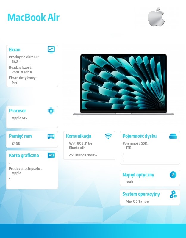 Wydajność M5. Czip w mig. AI przyspiesza. MacBook Air pozwala na błyskawiczne działanie funkcji AI dzięki potężnej kombinacji GPU, systemu Neural Engine i zunifikowanej pamięci RAM w czipie M5. Z każdym rdzeniem GPU zintegrowane są akceleratory Neural Accelerator, które jeszcze sprawniej wykonują zadania oparte na sztucznej inteligencji. Od zwiększania rozdzielczości obrazów przy użyciu AI po uruchamianie najnowszych dużych modeli językowych Twoja wydajność i twórcze rozwiązania zyskują dodatkowy napęd. Wielozadaniowiec. Wielokrotnie szybszy. Czip M5 zapewnia jeszcze większą szybkość i płynność we wszystkim, co robisz. Z łatwością przełączysz się między wieloma apkami i kartami, bez trudu zmontujesz wideo 4K i zagrasz w realistyczne gry takie jak Neverness to Everness. A to wszystko na laptopie, który jest bezszelestny, bo ma konstrukcję bez wentylatora. Bateria z pełnią życia. Z MacBookiem Air działasz nawet 18 godzin. A ponieważ obsługuje szybkie ładowanie, energię uzupełnisz do 50 procent w zaledwie 30 minut. Dlatego z łatwością zajmiesz się wszystkim od pracy i nauki po oglądanie ulubionych filmów nie martwiąc się o baterię. Sztuczna inteligencja Stworzony dla AI. Od czipa poczynając. Wszyscy pracujący z komputerem, od studentów do właścicieli małych firm i profesjonalnych twórców, docenią jak MacBook Air z czipem M5 wykorzystuje możliwości sztucznej inteligencji w codziennych zadaniach, jednocześnie dbając o prywatność. Przy tym jest stworzony dla Apple Intelligence, czyli potężnych funkcji działających w różnych apkach i w systemie macOS. Uruchamiasz duży model językowy czy zajmujesz się vibe coding cokolwiek robisz na Macu, robisz wydajnie i bezpiecznie. Stworzony dla Apple Intelligence. Zrobisz więcej. Z łatwością. *System dostępny w wybranych językach Apple Intelligence to osobisty system sztucznej inteligencji, który pomaga pisać, wyrażać siebie i ogarniać wszystko bez wysiłku. Przełomowe rozwiązania chroniące prywatność dają Ci spokój ducha, bo nikt poza Tobą - nawet Apple - nie ma dostępu do Twoich danych. Potężne możliwości. Z potężną ochroną prywatności. System Apple Intelligence został zaprojektowany z myślą o nieustannej ochronie Twojej prywatności. Przetwarza dane bezpośrednio na Macu i jest z nim ściśle zintegrowany. Ma więc dostęp do Twoich osobistych informacji, ale ich nie gromadzi. A dzięki przełomowej prywatnej chmurze obliczeniowej Apple Intelligence może korzystać z większych modeli dostępnych na serwerach działających na układach scalonych Apple i obsługiwać bardziej złożone zapytania, nie zaniedbując ochrony prywatności. macOS Umożliwiacz. macOS został zaprojektowany tak, żeby wspierać Cię przy pracy, twórczości i w kontaktach za pomocą potężnych apek i płynnej wielozadaniowości. Wyświetlacz Miłość od każdego wejrzenia. Wyświetlacz Liquid Retina w MacBooku Air wyświetla miliard kolorów i ma oszałamiającą rozdzielczość. Zdjęcia i filmy imponują kontrastem i bogactwem detali, a tekst jest wyjątkowo czytelny. Audio i kamera Podąża za Tobą. Układ trzech mikrofonów.MacBook Air zwiększa klarowność głosu podczas rozmów audio i wideo oraz ogranicza dźwięki otoczenia do minimum. Kapitalne audio. Głośniki MacBooka Air odtwarzają dźwięk przestrzenny w standardzie Dolby Atmos. Podczas słuchania muzyki i oglądania filmów umieszczają Cię w samym środku trójwymiarowej sceny akustycznej. Porty i łączność Mac ma kontakty. Wtyk przewodu zasilającego MagSafe podłącza się i odłącza za pomocą wbudowanych magnesów, więc potknięcie się o kabel nie pociąga za sobą niepożądanych skutków. Ani komputera. Dwa porty Thunderbolt 4 pozwalają podłączać superszybkie akcesoria i ładować Maca. Do gniazda słuchawkowego wepniesz słuchawki o wysokiej impedancji. Czip Apple N1 do łączności bezprzewodowej zapewnia obsługę interfejsów WiFi 7 i Bluetooth 6, zwiększając ich wydajność i niezawodność. Możesz zmienić MacBooka Air w doskonałą stację roboczą, podłączając nawet dwa wyświetlacze zewnętrzne, w tym Studio Display. Z dodatkowym miejscem do pracy na ekranie zadania z wieloma dokumentami lub apkami ogarniesz w trymiga. Bezpieczeństwo Jedno dotknięcie i masz spokój. Touch ID w klawiaturze Magic Keyboard pozwala szybko, łatwo i bezpiecznie odblokowywać Maca, logować się do kont i autoryzować płatności za zakupy. A wbudowane mechanizmy szyfrowania, solidna ochrona przed wirusami i bezpłatne, automatyczne aktualizacje zabezpieczeń dbają o bezpieczeństwo Twoich danych.