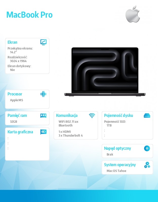 MacBook Pro Wydajność Wszystkiego najszybszego. Czip M5 dołącza do M4 Pro i M4 Max. Każdy z tych układów zapewnia fenomenalną wydajność jedno- oraz wielowątkową CPU i ma szybszą pamięć zunifikowaną, co pozwala rozwijać prędkości, o których nawet Ci się nie śniło. A dzięki potężnym akceleratorom Neural Accelerator w M5 możesz działać z AI w błyskawicznym tempie. W każdy rdzeń GPU czipa M5 wbudowany jest potężny akcelerator Neural Accelerator, co wybitnie przyspiesza zadania AI, takie jak generowanie obrazów w modelach dyfuzyjnych czy przetwarzanie promptów w dużych modelach językowych (LLM). A 16-rdzeniowy system Neural Engine obsługujący funkcje Apple Intelligence sprawia, że sztuczna inteligencja na pokładzie urządzenia działa z wielką mocą, a przy tym energooszczędnie. Uruchamiaj wymagające procesy graficznie z responsywnością nadążającą za Twoją wyobraźnią. Czip M5 ma GPU z ulepszonymi rdzeniami shaderów oraz silnikiem ray tracingu trzeciej generacji, dzięki czemu gry stają się bardziej realistyczne i wciągające. A technologia dynamic caching optymalizuje działanie zunifikowanej pamięci RAM, mocno podnosząc wykorzystanie GPU. W rezultacie odczujesz niebywały skok wydajności w najbardziej wymagających grach i pro aplikacjach. Trzy czipy. Nieskończone możliwości. Czip M5 przynosi przełomową prędkość i potężne, działające na urządzeniu narzędzia AI dla tych, co studiują, prowadzą biznes czy realizują się twórczo. Stworzony dla AI. Od czipa poczynając. Układ scalony Apple i wszystkie kluczowe, napędzające go podsystemy zostały zaprojektowane z myślą o sztucznej inteligencji, łącząc sprzęt, oprogramowanie i ekosystem w jedną potężną platformę. Dlatego możesz przetwarzać wymagające zadania oparte na AI bezpośrednio na urządzeniu i z niesamowitą energooszczędnością. A przy tym masz pewność, że wbudowane funkcje bezpieczeństwa i ochrony prywatności są integralną częścią całego systemu, a nie tylko dodatkiem. Apple Intelligence. Zadajesz zadanie. I zrobione. Apple Intelligence pomaga pisać, wyrażać siebie i ogarniać wszystko bez wysiłku. Zamień krótką notatkę w profesjonalne ogłoszenie. Usuń ze zdjęć niechciane obiekty za pomocą narzędzia Oczyść. Kreuj wyjątkowe obrazy za pomocą nowych stylów ChatGPT w Image Playground. I korzystaj z inteligentnych akcji w apce Skróty, żeby tworzyć automatyzacje - na przykład porównywać transkrypcję audio z notatkami czy wyodrębniać kluczowe informacje z pliku PDF. Apple Intelligence to Twoje AI. Działaj. Potężne możliwości. Z potężną ochroną prywatności. System Apple Intelligence zaprojektowano z myślą o nieustannej ochronie Twojej prywatności. Przetwarza dane bezpośrednio na Macu i jest z nim ściśle zintegrowany. Ma więc dostęp do Twoich osobistych informacji, ale ich nie gromadzi. A dzięki przełomowej prywatnej chmurze obliczeniowej Apple Intelligence może korzystać z większych modeli dostępnych na serwerach działających na układach scalonych Apple i obsługiwać bardziej złożone zapytania, chroniąc jednocześnie Twoją prywatność. Bateria na cały dzień bez gniazdka. MacBook Pro ma najdłuższy czas pracy na baterii w historii Maca - nawet 24 godziny. A ponieważ obsługuje szybkie ładowanie, energię uzupełnisz do 50 procent w zaledwie 30 minut. Wszystkie modele zapewniają tę samą fantastyczną wydajność niezależnie od tego, czy są podłączone do gniazdka, czy nie. A Ty, zamiast szukać kontaktu, pozostajesz w kontakcie ze swoją pasją. macOS Tahoe Najnowszy. I tak znajomy. macOS Tahoe wprowadza nowy, choć znajomy wygląd - Liquid Glass. To najpiękniejsza i najpotężniejsza wersja macOS w historii, pełna nowych sposobów na zwiększenie produktywności, płynną współpracę z iPhonem i jeszcze lepsze wykorzystanie potencjału Apple Intelligence. Mac + iPhone Razem mogą jeszcze więcej. Mac i iPhone same w sobie są niezwykłe. Ale razem potrafią zdziałać cuda. Dzięki funkcji Continuity możesz płynnie przełączać się między urządzeniami, żeby udostępniać pliki i zdjęcia, przenosić zadania, a nawet dzwonić bez sięgania po telefon. Aplikacje Jest wyzwanie? Jest na to apka. Od najpotrzebniejszych narzędzi biurowych przez Twoje ulubione gry aż po najbardziej zapracowane aplikacje profesjonalne dziesiątki tysięcy apek zoptymalizowano tak, żeby wykorzystywały pełen potencjał układu scalonego Apple. A na MacBooku Pro wszystkie działają jak marzenie. Wyświetlacz Daj się olśnić. Przejście z pracą ze słonecznego tarasu do ciemnej pracowni? Jasna sprawa. Olśniewający wyświetlacz Liquid Retina XDR zapewnia nawet 1600 nitów jasności szczytowej w trybie HDR. A w mocnym świetle osiąga nawet 1000 nitów dla treści SDR, żeby w plenerze wszystko na ekranie było bardziej czytelne. Z kolei gdy jest ciemno, zmniejsza jasność do 1 nita, by i wtedy pracowało się komfortowo. Kamera Zabłyśnij w centrum kadru. Kamera 12MP Center Stage sprawi, że wypadniesz świetnie w każdym świetle. A w połączeniu z zaawansowanymi mikrofonami i głośnikami pomoże Ci w zdalnym poprowadzeniu spotkania. Bezpieczeństwo Bez wątpienia. W Macu chroni Cię wszystko od układu scalonego Apple aż po architekturę macOS. Ta głęboka integracja sprzętu i oprogramowania oraz automatyczne aktualizacje zapewniają stabilne działanie i ochronę MacBooka Pro na lata. Architektura zabezpieczeń odpowiada za działanie rozwiązań takich jak Touch ID czy apka Znajdź, a także za zaawansowane mechanizmy obrony przed wirusami i złośliwymi programami.