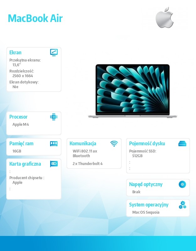 MacBook Air MacBook Air jest niezwykle lekki i ma niewiele ponad centymetr grubości, dlatego idealnie wpasuje się w aktywny tryb życia i z łatwością zmieści się w Twojej torbie. Model z czipem M4 jest wykonany w ponad 50 procentach z materiałów z recyklingu i chroni go wytrzymała obudowa z odzyskanego aluminium. M4. Czip w mig. Wielozadaniowiec. Wielokrotnie szybszy. Wyposażony w czip M4 MacBook Air zapewnia jeszcze większą prędkość i płynność podczas każdej pracy, na przykład przy przełączaniu między wieloma aplikacjami i kartami, montażu filmów czy graniu w takie gry jak Sid Meiers Civilization VII. A przy tym działa bezszelestnie, bo ma pozbawioną wentylatora konstrukcję. Neural Engine. AI jak błyskawica. Czip M4 ma szybszy system Neural Engine, więc daje MacBookowi Air jeszcze większe możliwości AI, żeby usprawniać wszystko, co robisz. Od automatycznego wyśrodkowywania kadru przez zwiększanie rozdzielczości obrazów z pomocą sztucznej inteligencji po uruchamianie najnowszych dużych modeli językowych Twoja produktywność i kreatywność nigdy nie miały się lepiej. Bateria z pełnią życia. Z MacBookiem Air działasz nawet 18 godzin. A ponieważ obsługuje szybkie ładowanie, energię uzupełnisz do 50 procent w zaledwie 30 minut. Dlatego wykonasz każde zadanie, nie martwiąc się o baterię. Wyświetlacz Liquid Retina w MacBooku Air obsługuje miliard kolorów. Zdjęcia i filmy imponują kontrastem i bogactwem detali, a tekst jest wyjątkowo czytelny.