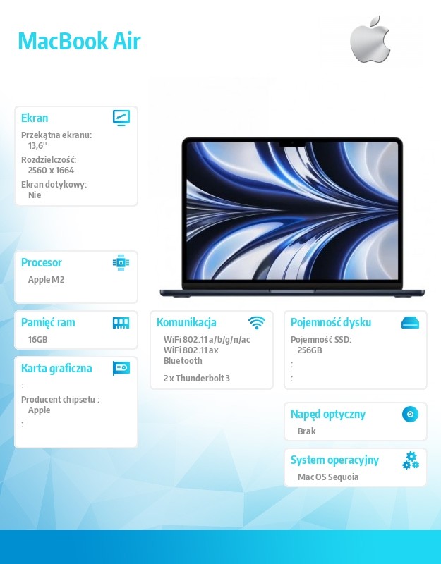 MacBook Air Poważny sprzęt, co prawie nic nie waży. Turbodopalany czipem M2 Przeprojektowany pod kątem czipa M2 nowej generacji, niewiarygodnie smukły MacBook Air w wytrzymałej aluminiowej obudowie zachwyca energooszczędnością i szybkością działania. To ultrawydajny, superwszechstronny laptop do pracy, zabawy i tworzenia, czego tylko chcesz. Gdziekolwiek Ci się zamarzy. Od Północy do Księżycowej poświaty. Cztery wykończenia nie z tej ziemi. MacBook Air jest do wyboru w czterech przepięknych wykończeniach z dopasowanym kolorystycznie przewodem zasilającym MagSafe. Wydajność Zapnij pasy. M2 to pierwszy z nowej generacji układów scalonych Apple, oferujący jeszcze większą szybkość i energooszczędność niż przełomowy czip M1. Pozwala zdziałać więcej w krótszym czasie przy zwiększonej wydajności 8-rdzeniowego CPU. Tworzyć olśniewające obrazy i animacje z nawet 10 rdzeniowym GPU. Obsługiwać więcej strumieni wideo 4K i 8K ProRes za pomocą wysoce wydajnego silnika multimedialnego. I pracować lub bawić się cały dzień i dużą część nocy z baterią wystarczającą nawet na 18 godzin. Wyświetlacz Liquid Retina Wyraźnie widać, że zachwyca. Olśniewający wyświetlacz Liquid Retina 13,6 cala jest największym i najjaśniejszym w historii MacBooka Air. Z miliardem kolorów. Dlatego tekst jest czytelniejszy, a zdjęcia i filmy wyrazistsze oraz bardziej kontrastowe i szczegółowe. Audio i kamera Brzmisz, jak wyglądasz. Najlepiej. Kamera FaceTime HD 1080p i układ trzech mikrofonów sprawią, że w wideorozmowach zaprezentujesz się od najlepszej strony. A system czterech głośników z dźwiękiem przestrzennym przeniesie Cię w sam środek rozległego pejzażu akustycznego. MacBook Air czaruje na wiele sposobów. Magic Keyboard Daj palcom pohasać. Wygodna i cicha klawiatura Magic Keyboard ma teraz rząd klawiszy funkcyjnych o pełnej wysokości, zapewniających szybki dostęp do Twoich ulubionych elementów sterujących i skrótów. Dzięki Touch ID możesz łatwo odblokowywać Maca, wprowadzać hasła, bezpiecznie robić zakupy i płacić dotknięciem palca. A na obszernym gładziku Force Touch masz większą swobodę wykonywania precyzyjnych czynności. Łączność Nieograniczone kontakty. Dzięki wbudowanym magnesom wygodny i bezpieczny wtyk przewodu zasilającego MagSafe łatwo się podłącza i odłącza, więc komputerowi nie grozi niebezpieczny upadek. Korzystając z dwóch portów Thunderbolt, możesz podłączać i ładować superszybkie akcesoria. Albo używać dodatkowego wyświetlacza o rozdzielczości nawet 6K. A do gniazda słuchawkowego bez problemu wepniesz słuchawki o wysokiej impedancji.